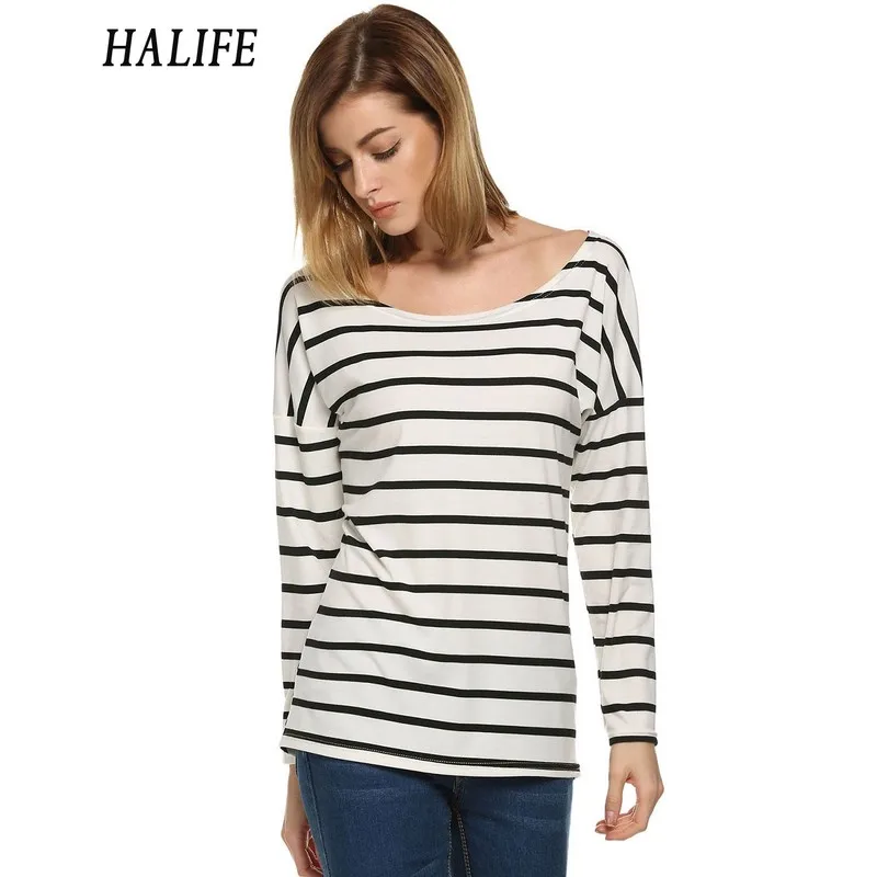 HALIFE Korean Clothes Striped T Shirt Women Tops Long